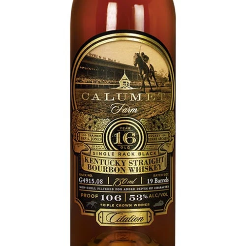 Calumet Farm 16 Year-Old Bourbon Whiskey is part of the Single Rack Black premium bourbon line. This exquisite bourbon pays homage to one of the most legendary thoroughbreds in racing history, Citation. The passion and dedication that led Citation to victory are evident in every sip of this bourbon, which exemplifies the zealous patience it takes to create a true champion. Aged for 16 years in the heart of bourbon country, Bardstown, Kentucky, this bourbon is non-chill filtered to add depth of character and color. The mash bill of 74% corn, 18% rye, and 8% malted barley creates a deep mahogany color with dark red shadows and golden highlights. The taste is a harmonious balance of notes of saturated oak and warm rye spice, allowing flavors of cherries, dark fruits, and baking spices to shine through. The finish is rounded out by notes of freshly baked bread, toasted toffee, and a light cornmeal dryness.