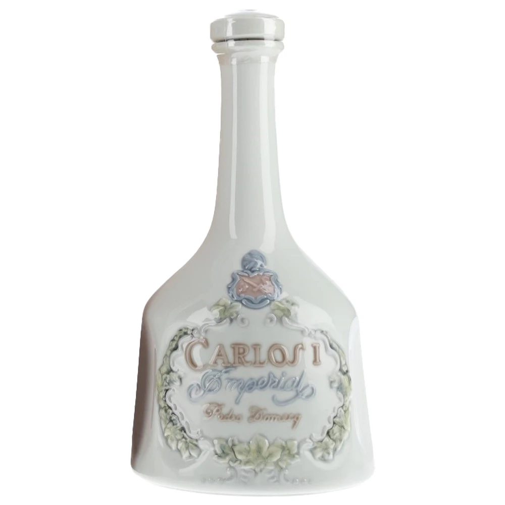 The porcelain bottle was designed to hold Carlos I Imperial, the extra old expression from the legendary Spanish brand. The decanter, retired in 1991, comes in a wooden box with a porcelain plaque.