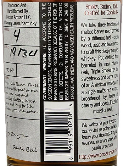 After smoking the barley, Bell mashes and ferments it before being distilled the wash through his 240-gallon, antique copper-pot still. Then, the whiskey is aged in new, charred American oak barrels, which contribute hints of cinnamon and allspice to the whiskey, and add an additional layer of complexity. Following maturation, Corsair Triple Smoke is brought to proof and bottled by hand.