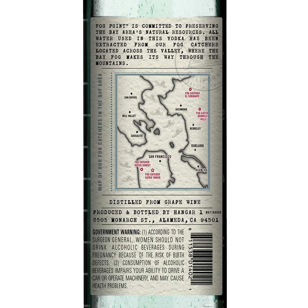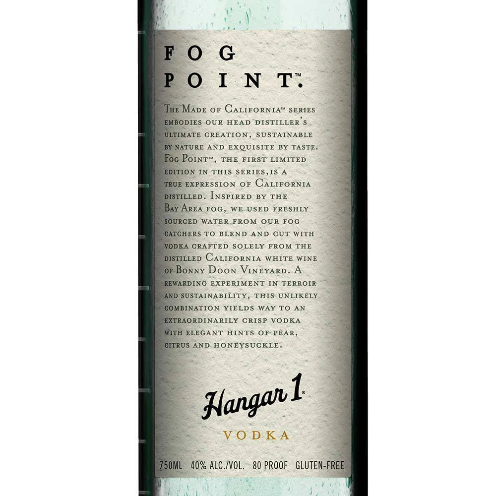 Hangar One Fog Point Vodka has a crisp, clean aroma and pronounced notes of citrus, particularly pear, on the palate. The finish is mildly sweet, with notes of honeysuckle lingering on the tongue.