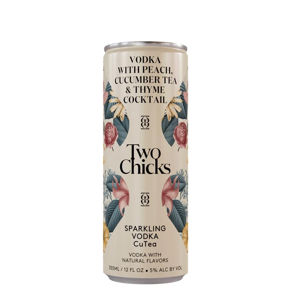 Two Chicks Sparkling Vodka CuTea is a vodka-based cocktail, made with natural flavors of savory peach, refreshing cucumber tea, and subtle thyme. Refreshing and sophisticated, this ready-to-drink cocktail is the quintessential summer concoction. Perfect for gatherings with friends or picnics in nature, itβs low in sugars with only 70 calories per serving. Enjoy chilled or over ice.